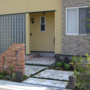 レンガの門壁と自然石の乱張りアプローチ