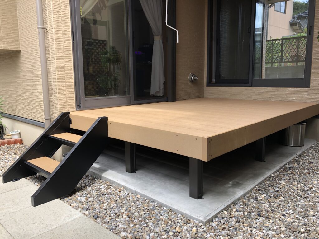 広々ウッドデッキと西日を遮る日除け付きテラス