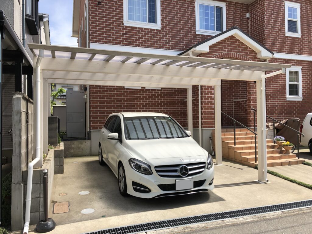 白いカーポートと薔薇の素敵なナチュラルガーデン