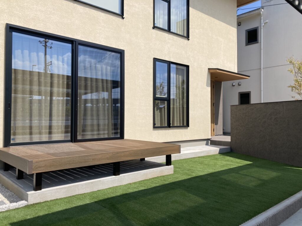 ラティスフェンスと木樹脂ウッドデッキ