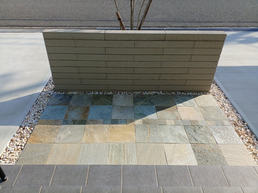 枕木の門柱と色鮮やかなシンボルツリーの植栽
