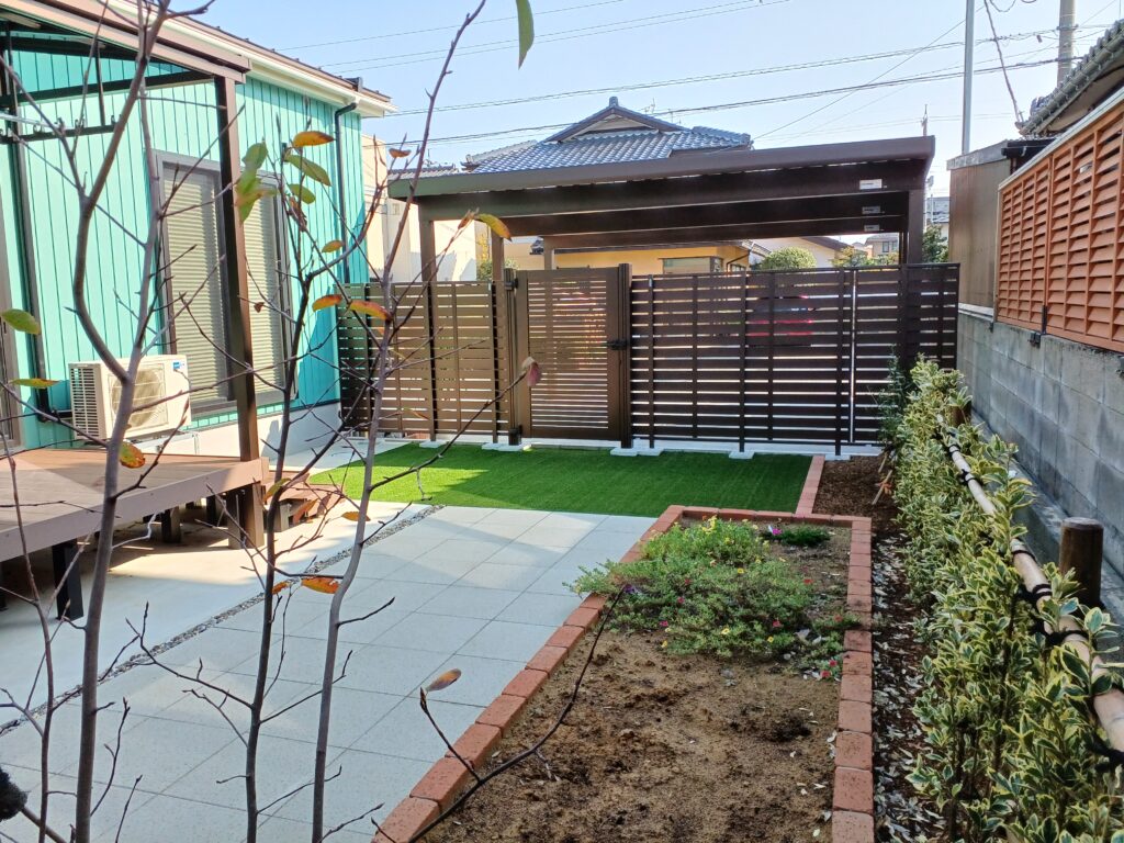 屋根の落雪安心の折板テラス駐輪場と目隠しフェンス