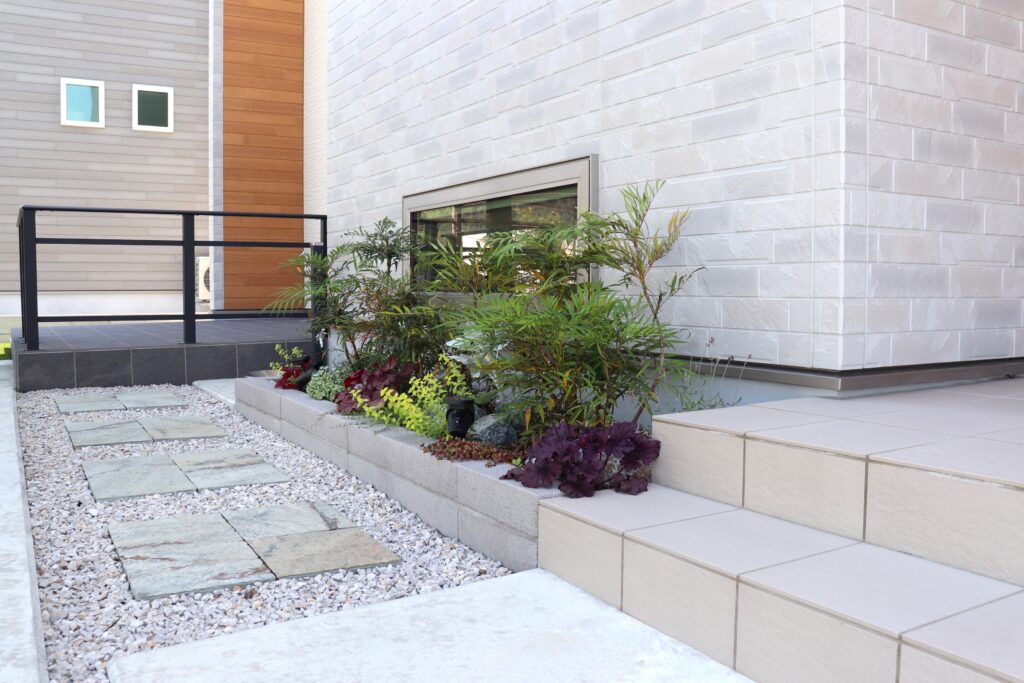 自然素材のアプローチをプランに取り入れたエクステリア