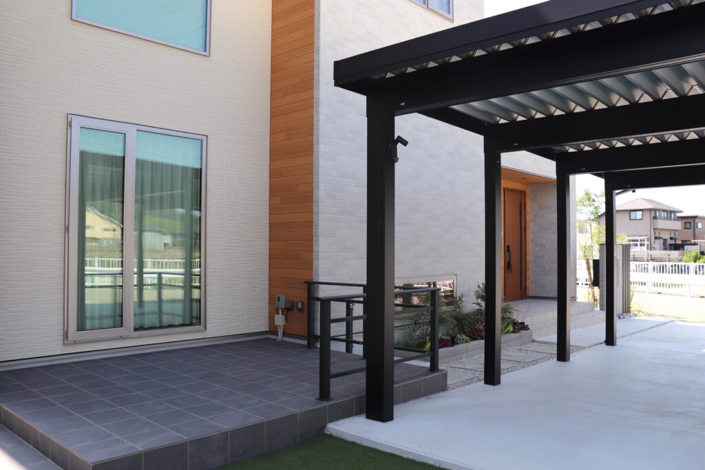 雨風除けのポーチテラスと重厚感ある玄関廻りの外構