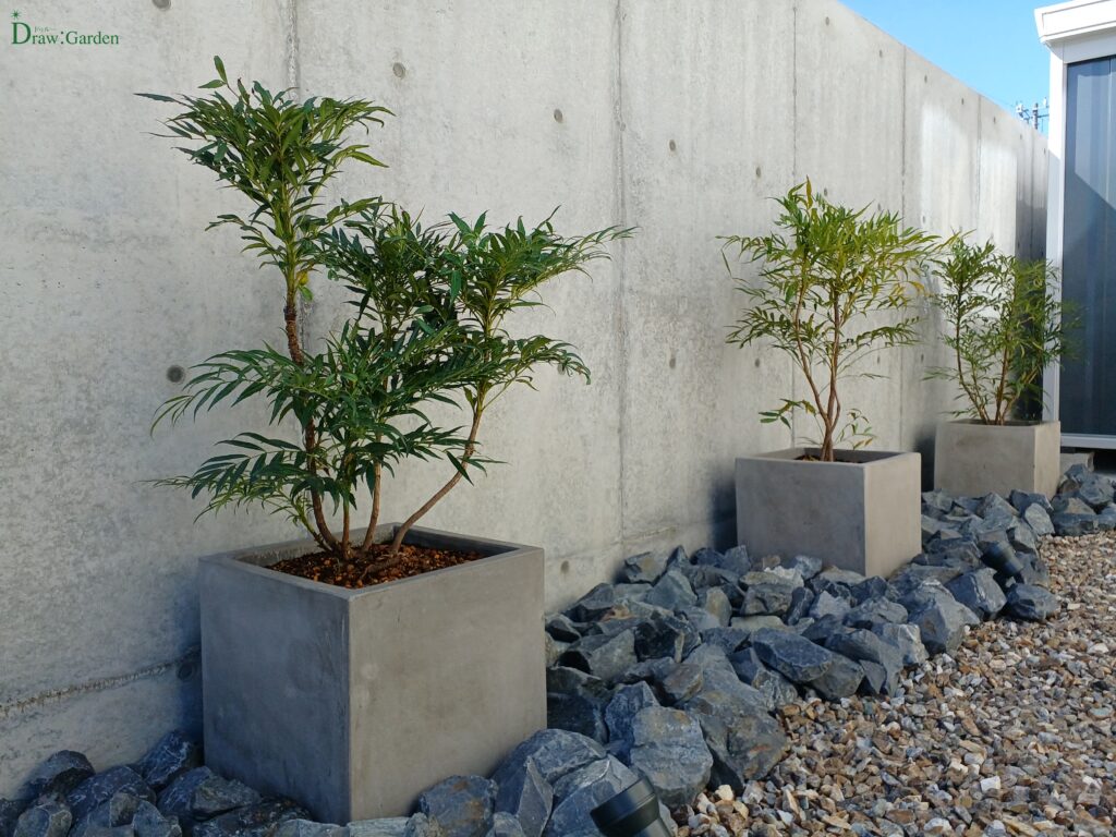 タマリュウの縁取りと自然石アプローチ