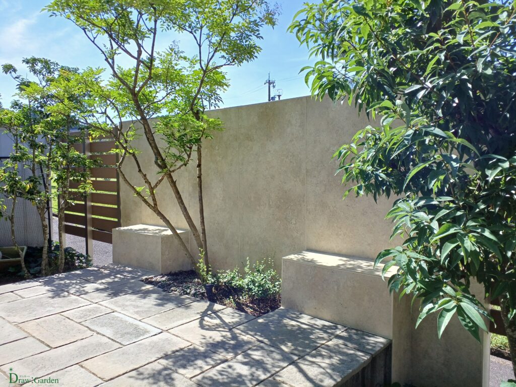 南部砂利洗出しに組合せた自然石乱貼りと樹木植栽