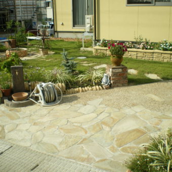 中庭と花壇をリフォーム、水はけの改善で芝生とバラを楽しむお庭