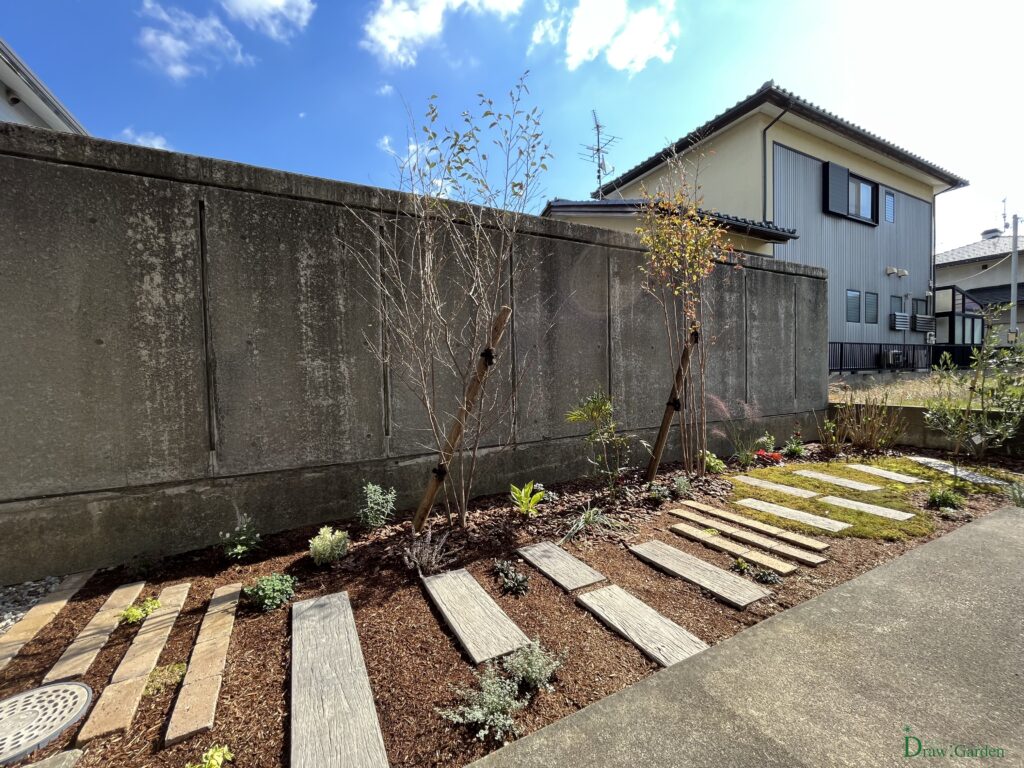 芝生のある暮らし、擬木プランターが似合う庭