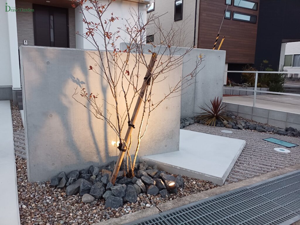 枕木の門柱と色鮮やかなシンボルツリーの植栽