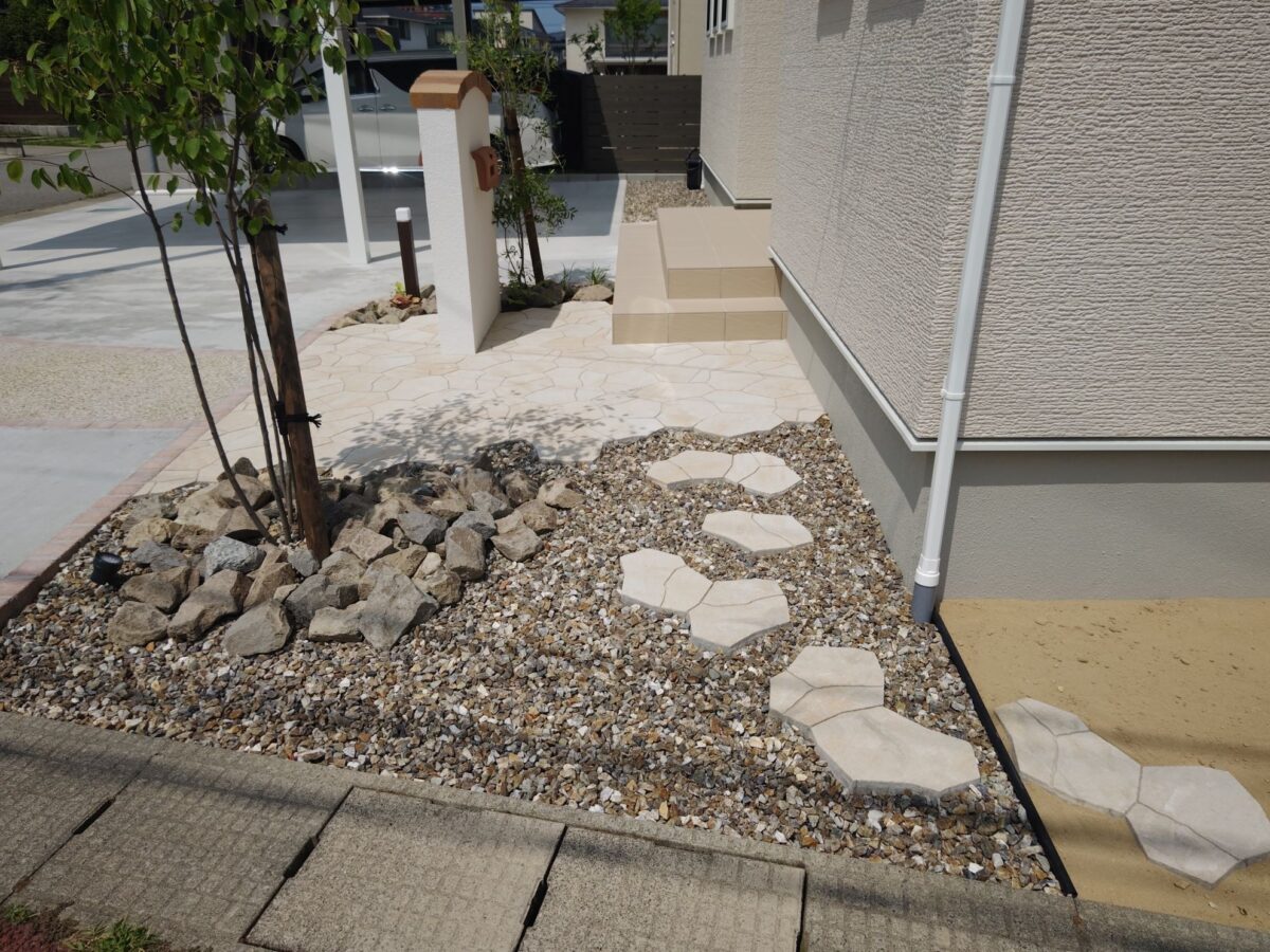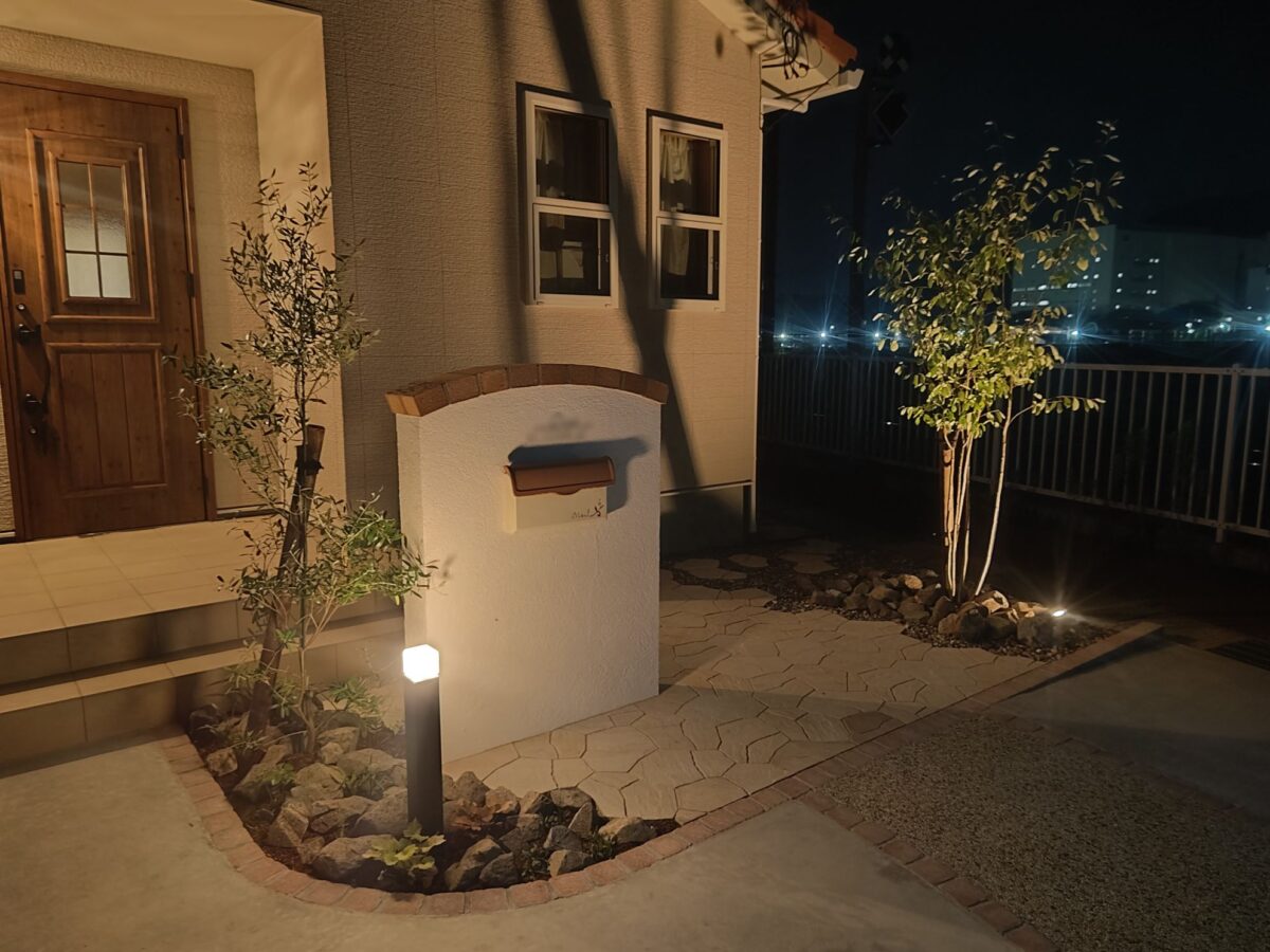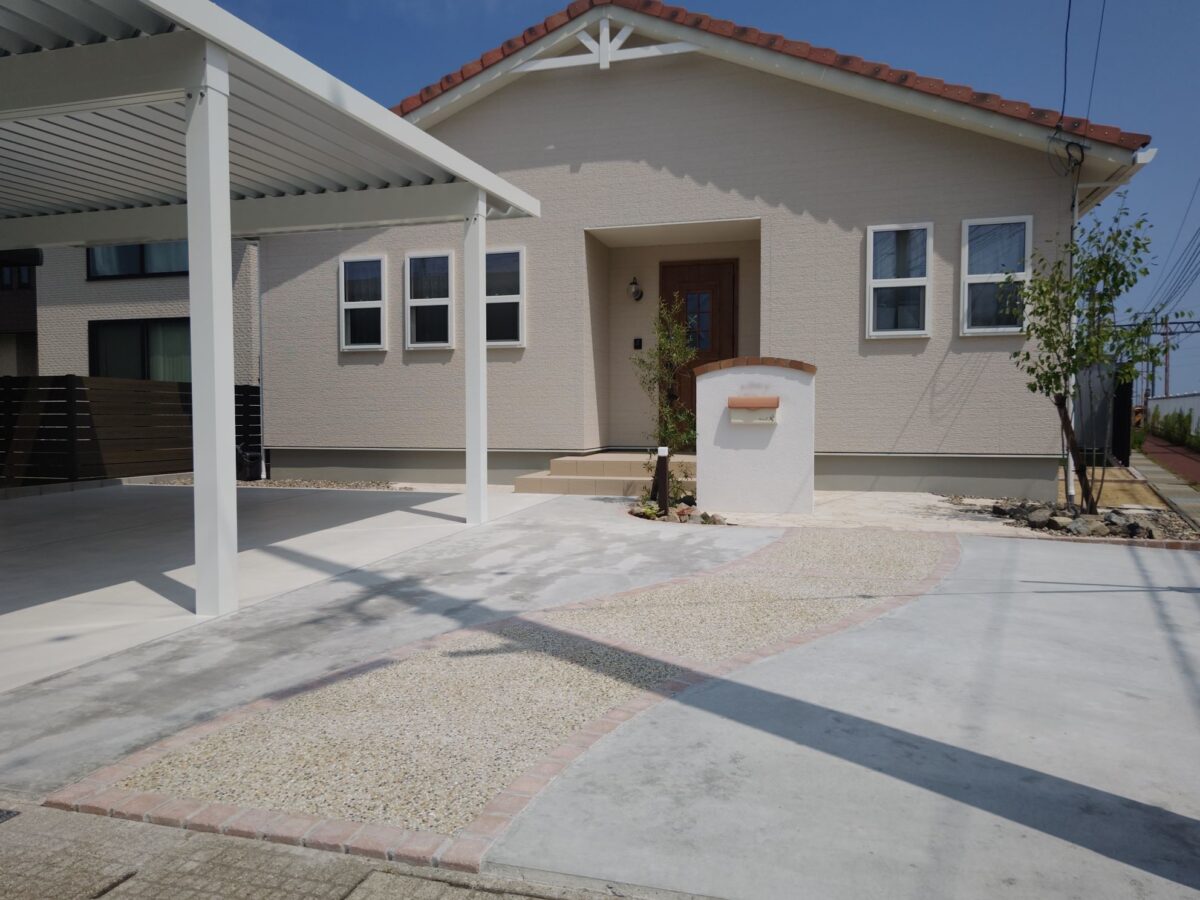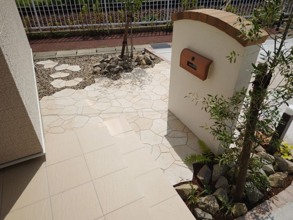 温かなイメージのお家に合わせたオープンファサードエクステリア。 レンガを並べた真っ白な門柱廻りのアプローチには、洗出し・飛び石・乱張りの 舗装園路でお客様を玄関まで導いてくれます。