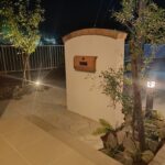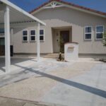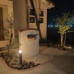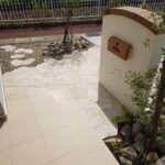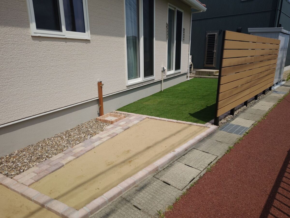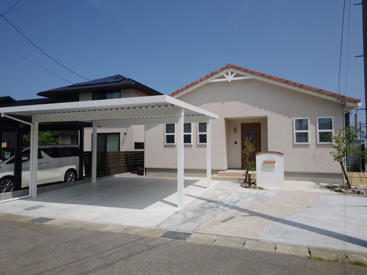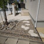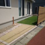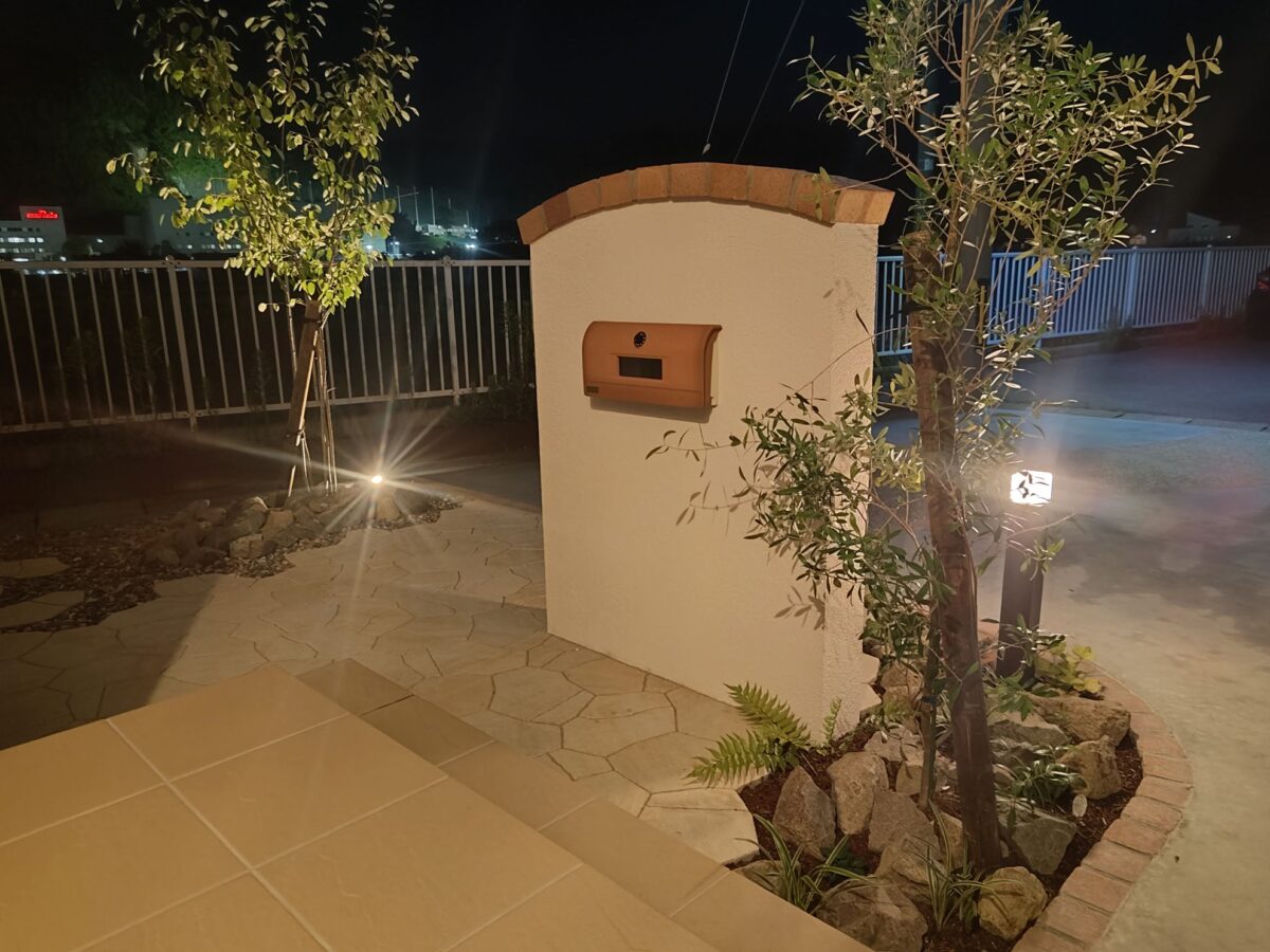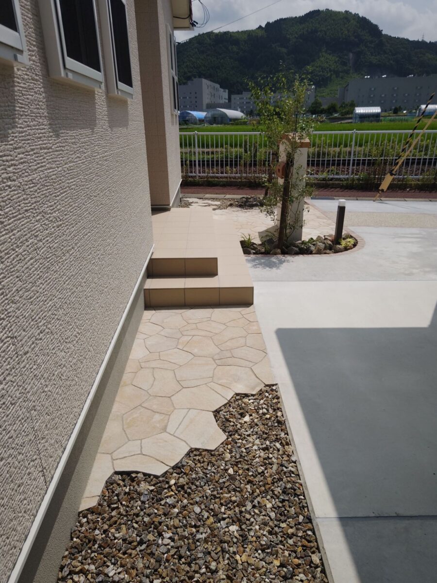 温かなイメージのお家に合わせたオープンファサードエクステリア。 レンガを並べた真っ白な門柱廻りのアプローチには、洗出し・飛び石・乱張りの 舗装園路でお客様を玄関まで導いてくれます。