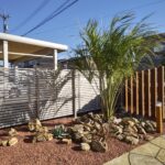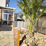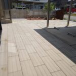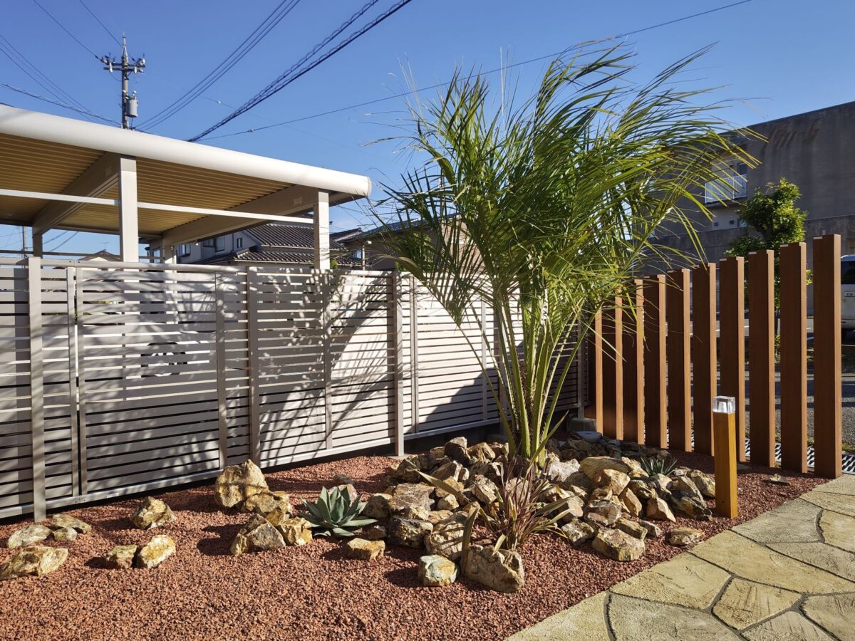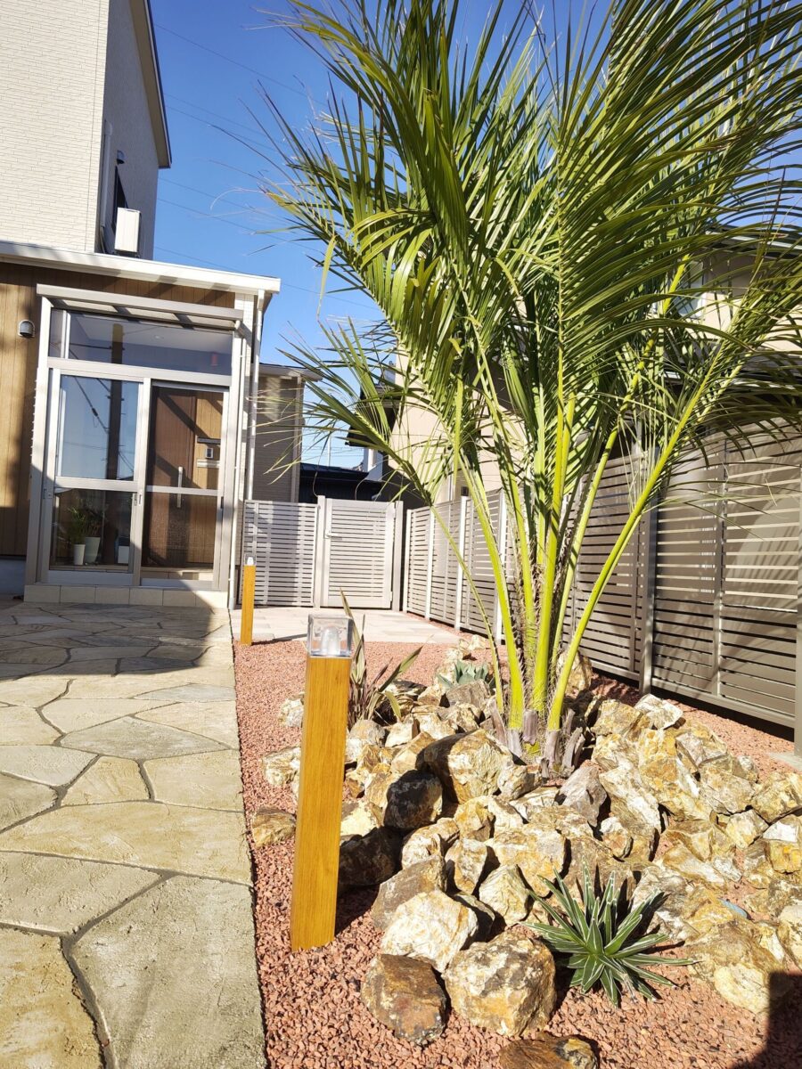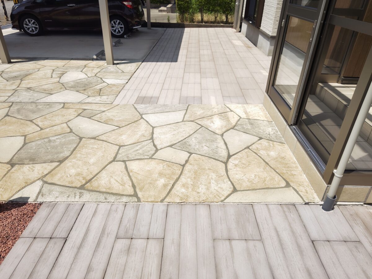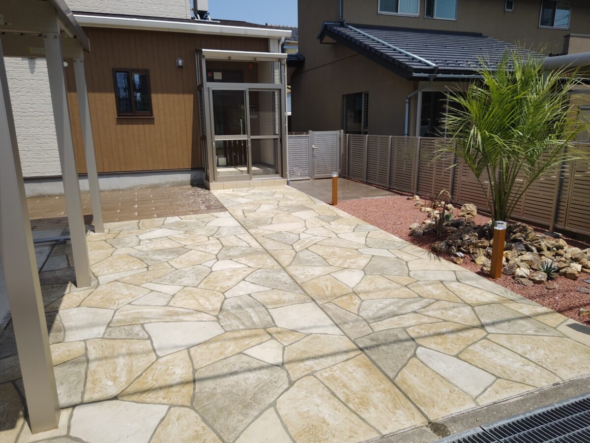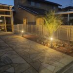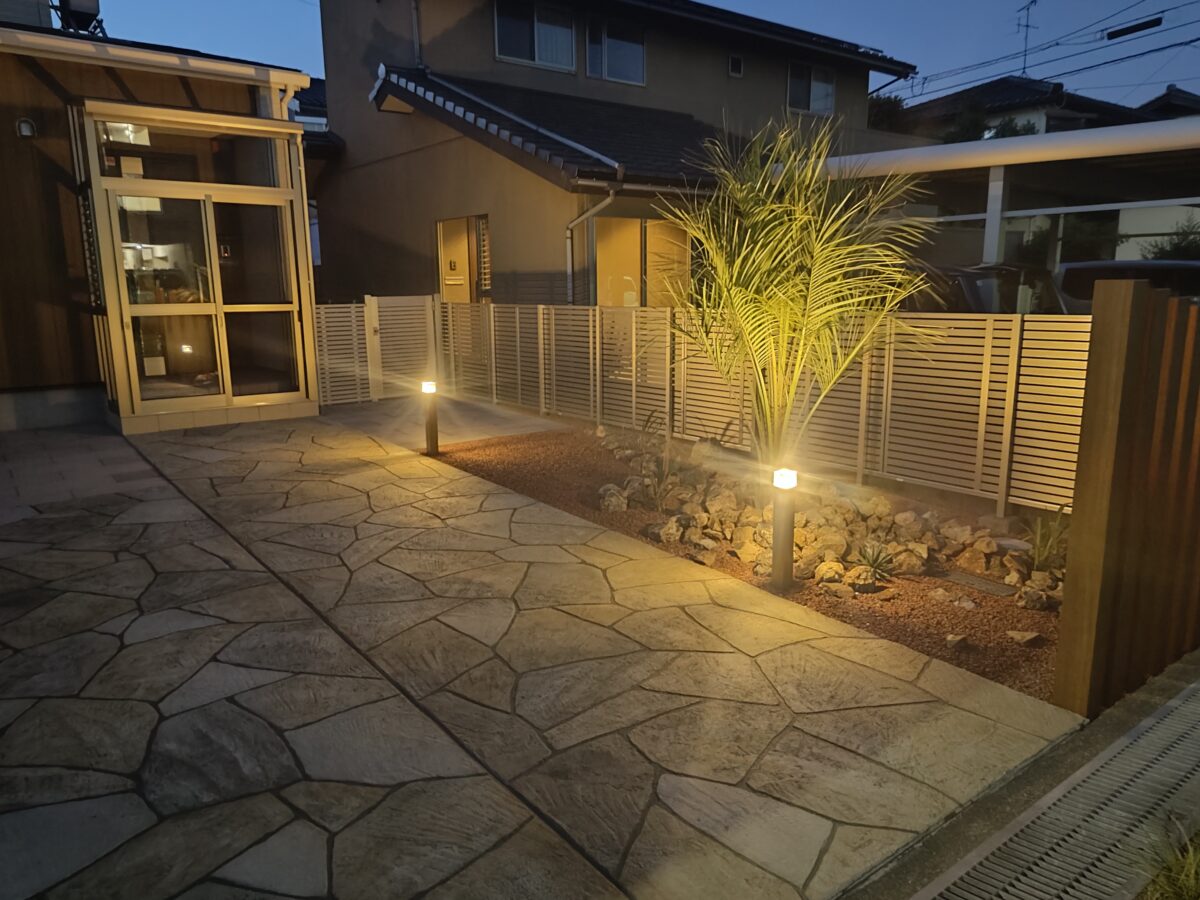 経年劣化により表面が傷んでしまったコンクリートには ローラーストーンという舗装用塗料によって生まれ変わります。 アプローチには、自然石の乱張り風に塗装することで 彩りとアクセントがつけられます。 傍らにはクールなロックガーデンとホットな夜間照明をプラス することで、昼夜の景観の雰囲気がさらに良くなりました。