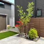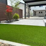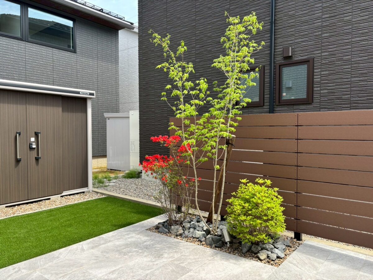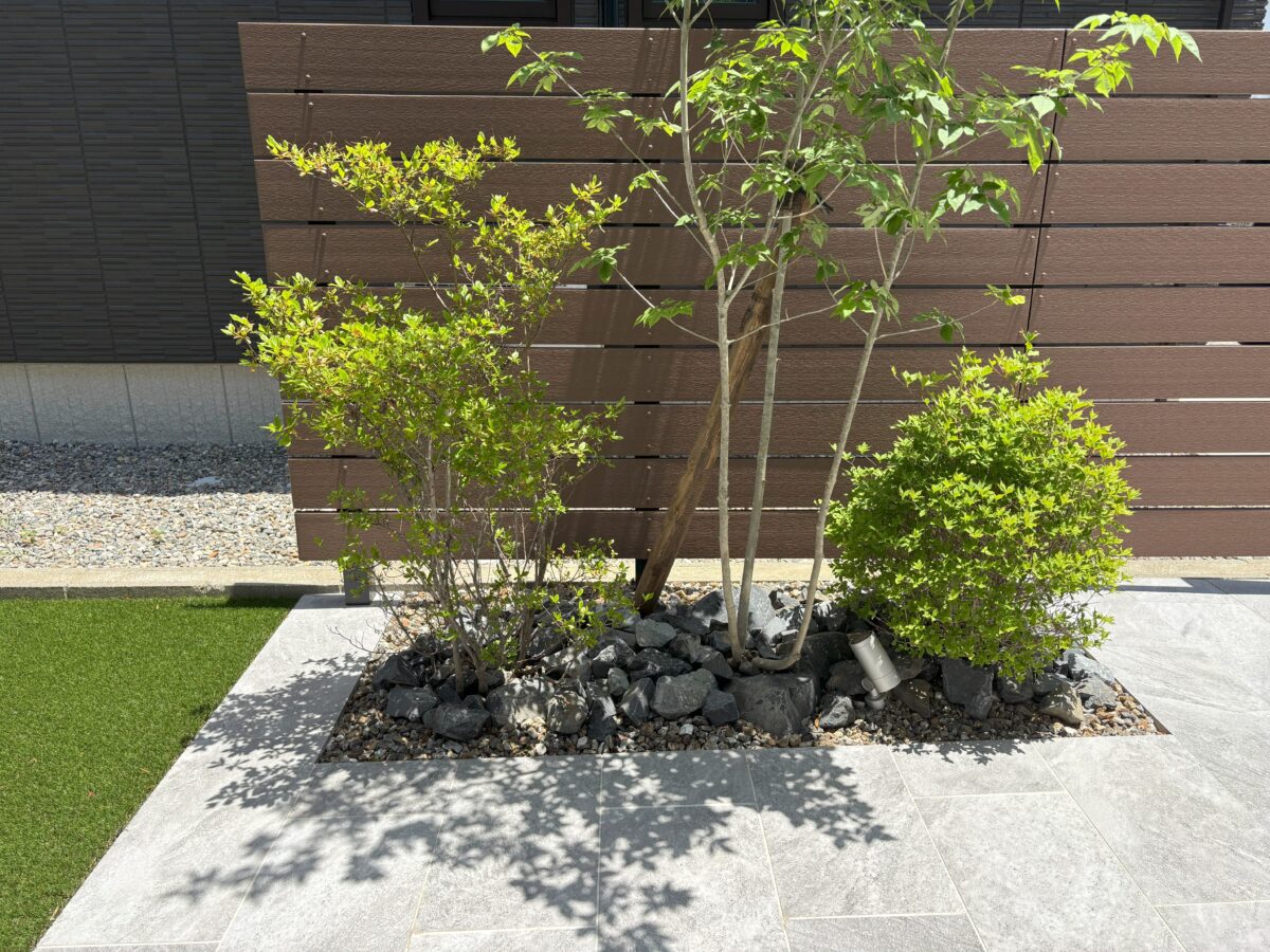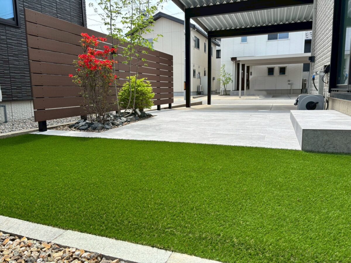 タイルテラスは車も停められる実用的な空間に。 既存の樹木にアオダモをプラスし、目隠しフェンスに緑が美しく映える心地よい景色を演出しました。 お子さまと安心して思いきり遊べる、家族の笑顔が広がる素敵なお庭になりました。