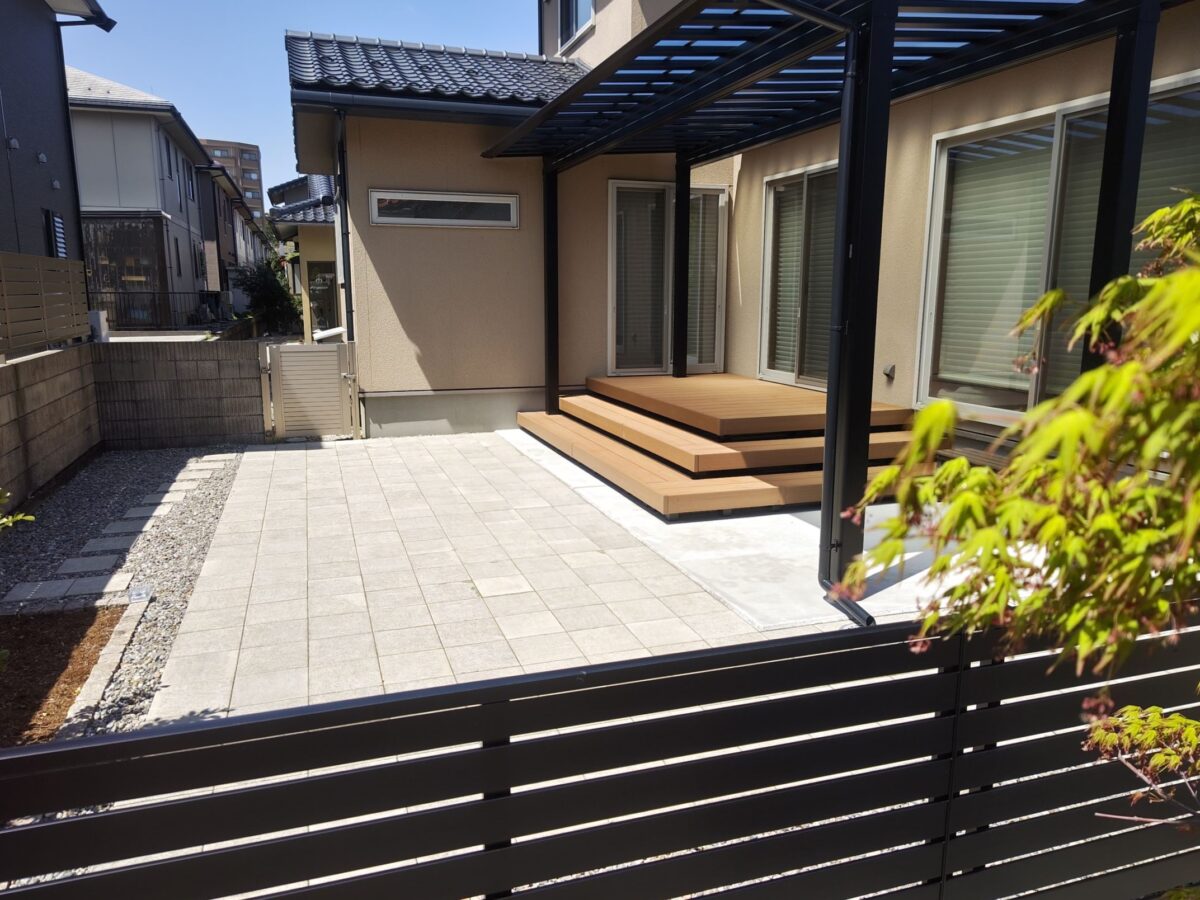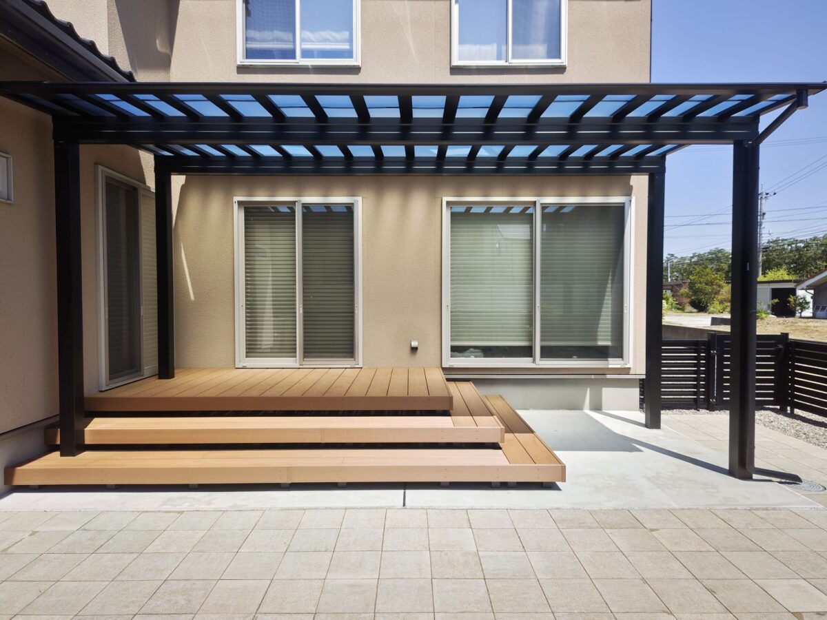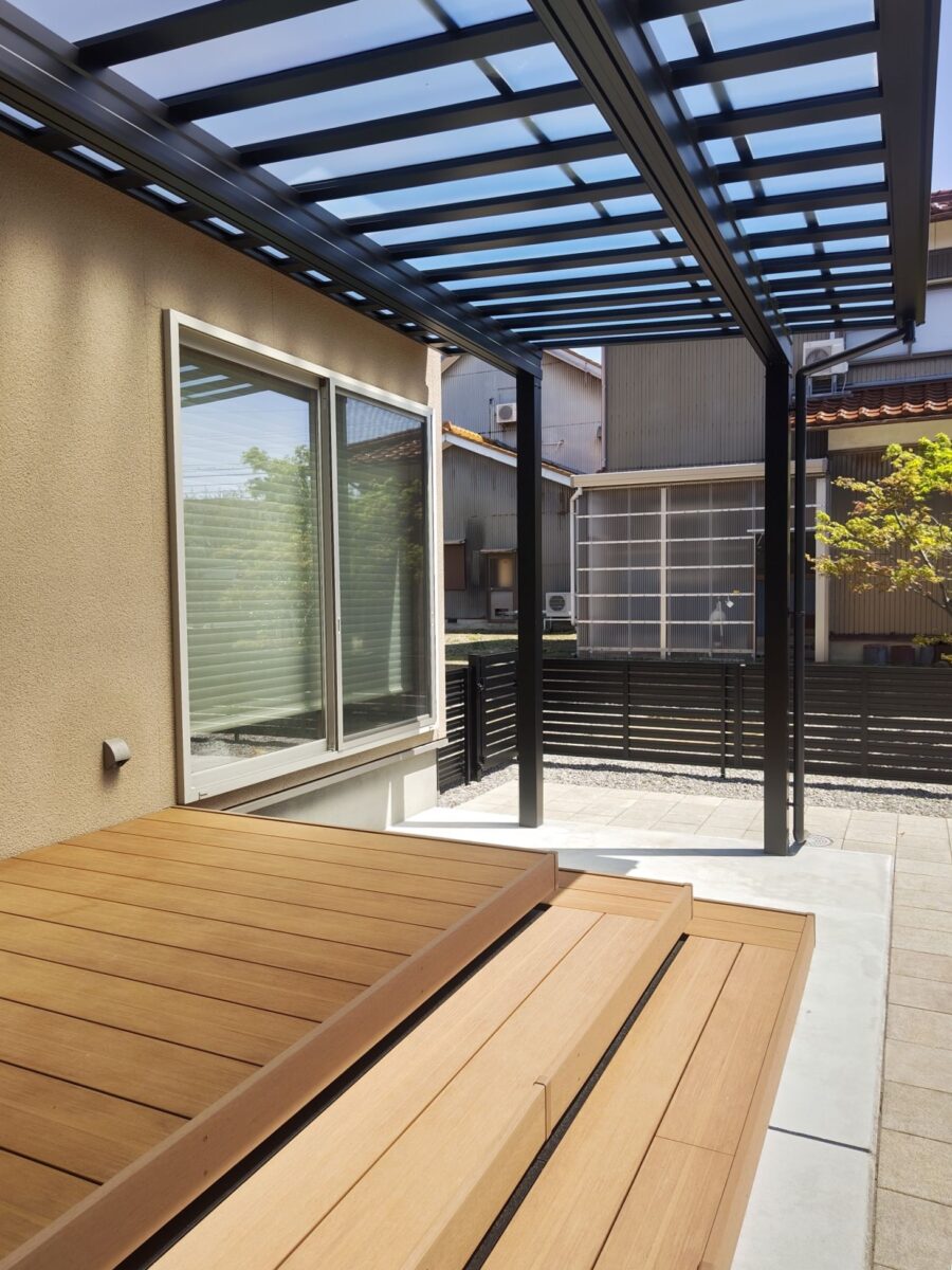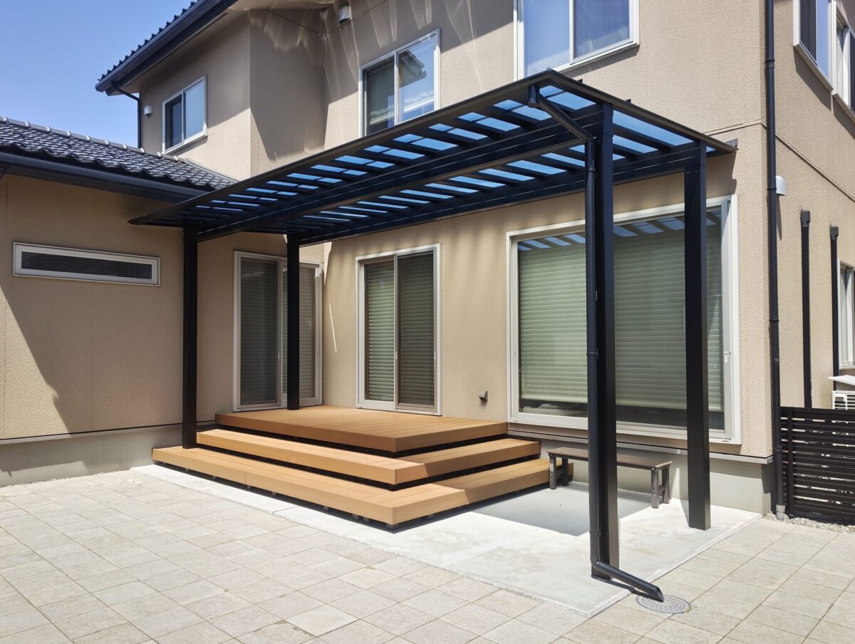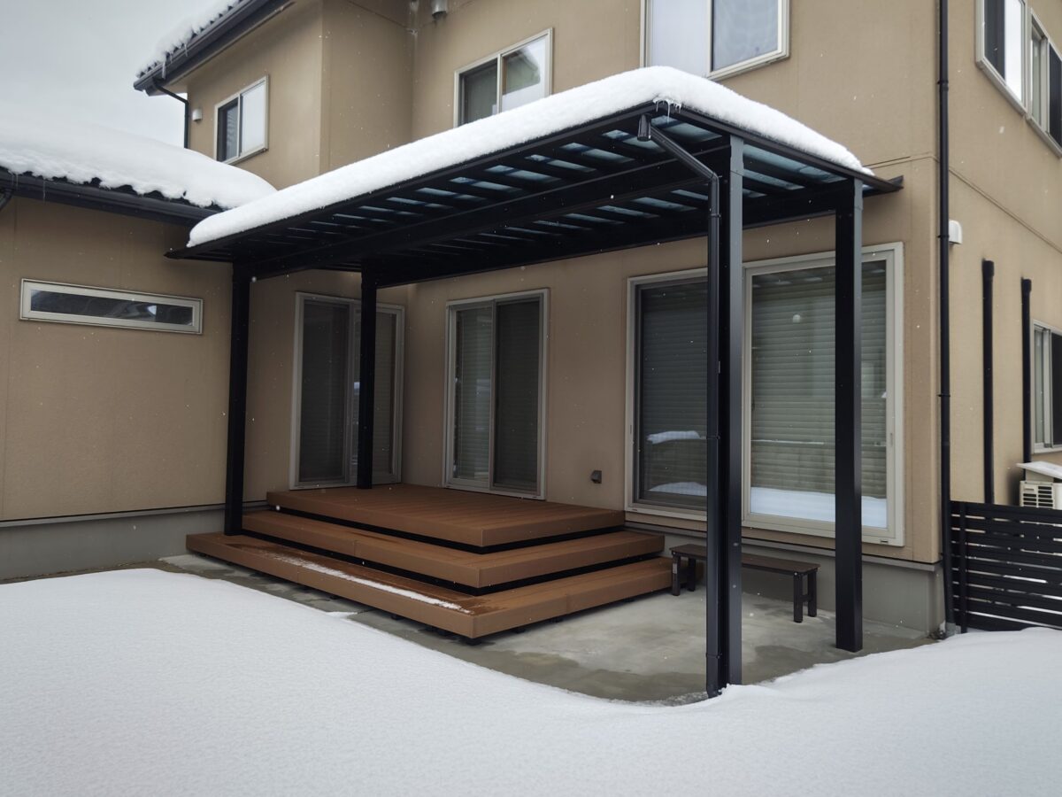 お庭に設置したテラス屋根には、夏の陽射しをしっかりカットし、 冬の積雪にも対応できるようミニカーポートを採用しました。 屋根の下にはステップ付きのウッドデッキを設置し、 お庭に出る機会が自然と増えるくつろぎのスペースに。 さらに、既存のインターロッキングを再利用して敷き直し ドッグランとして生まれ変わりました。