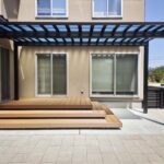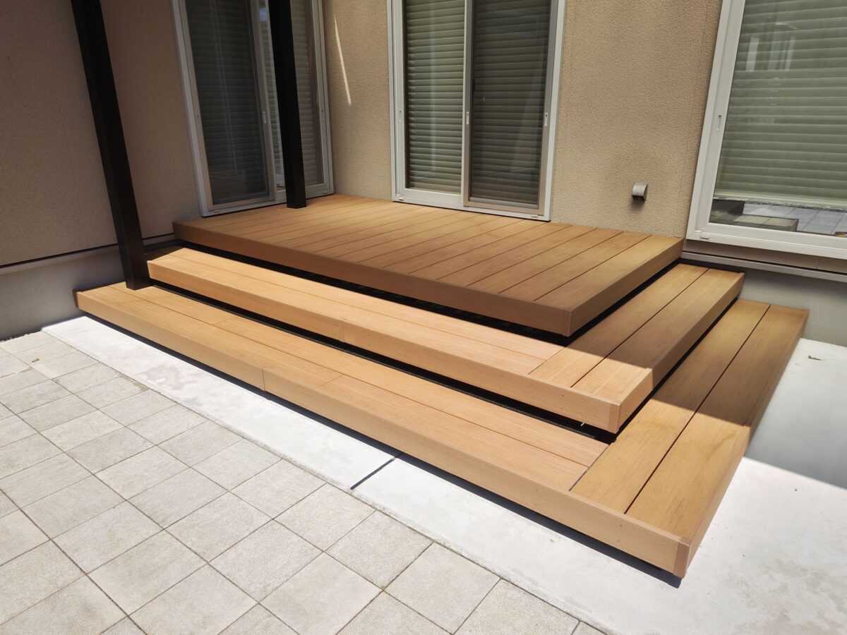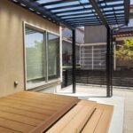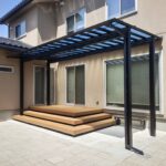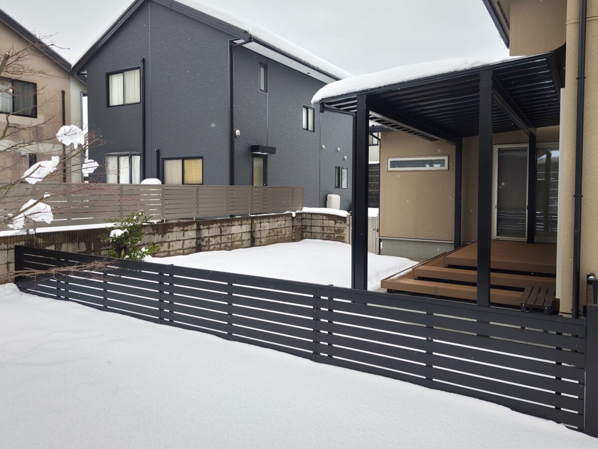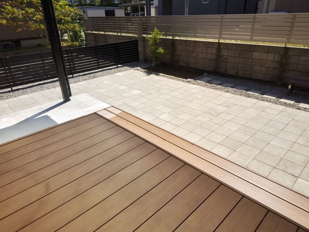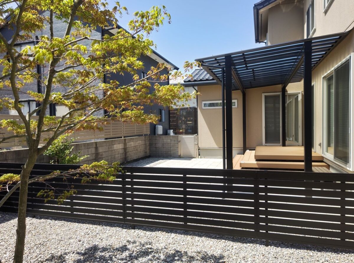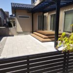 お庭に設置したテラス屋根には、夏の陽射しをしっかりカットし、 冬の積雪にも対応できるようミニカーポートを採用しました。 屋根の下にはステップ付きのウッドデッキを設置し、 お庭に出る機会が自然と増えるくつろぎのスペースに。 さらに、既存のインターロッキングを再利用して敷き直し ドッグランとして生まれ変わりました。