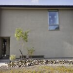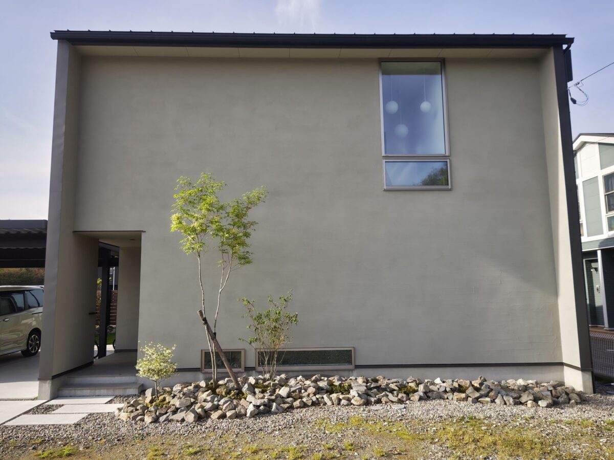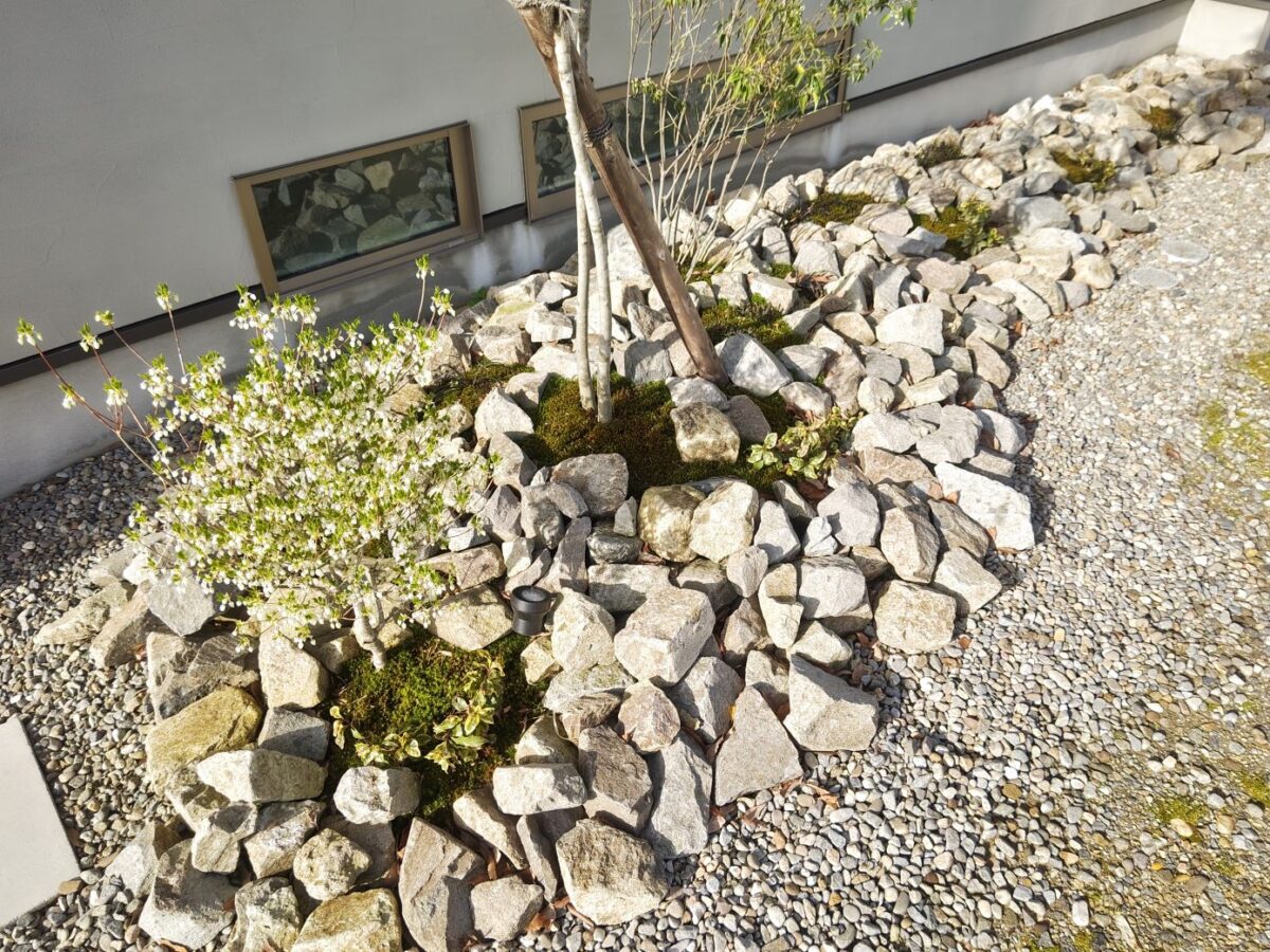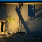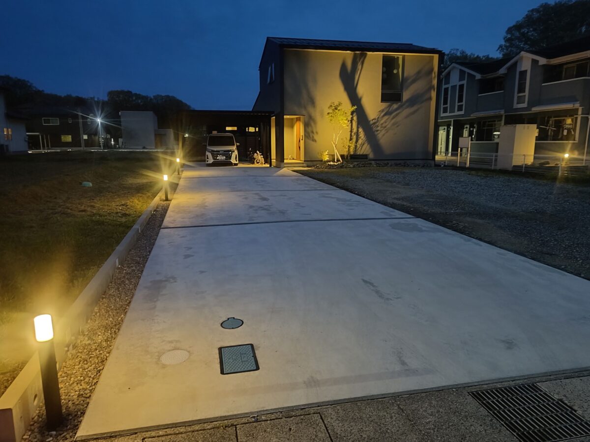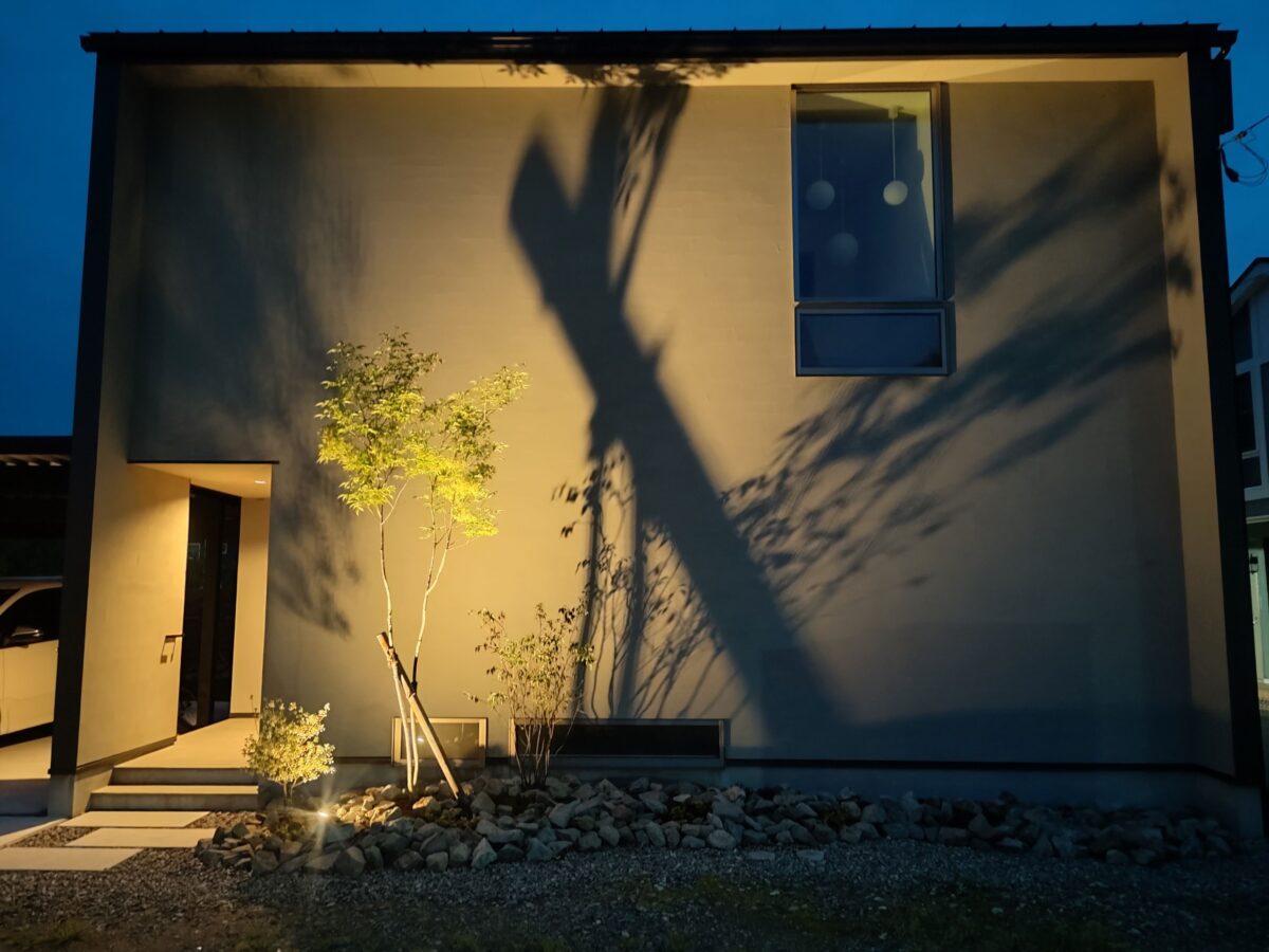 道路から施主様邸まで20mの距離を活かし、 奥行きのある景観を演出しました。 前庭は、ロックガーデンに杉苔を添えて和のテイストを創出。 主庭は、カーポートを額縁に見立てることで奥行きと広がりを 感じさせる構成としました。 夜には、照明によって樹木の陰影が外壁に映し出され、 距離があるからこそ際立つ印象的な景観を生み出します。 思わず近づきたくなる『距離』そのものを魅力に変えた外構です。